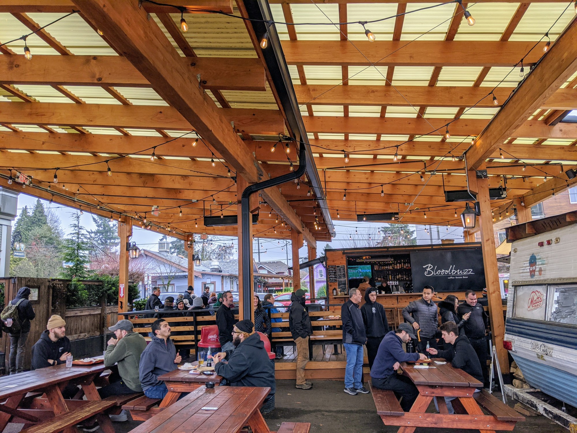Neither snow nor rain nor heat nor gloom of night will keep Portlanders from our food carts … so it’s nice to see more and more covered seating areas at pods popping up all over town. And Prost Marketplace on Mississippi has plenty of room to release your inner caveman and eat a giant beef rib from Matt’s BBQ by a fire pit.