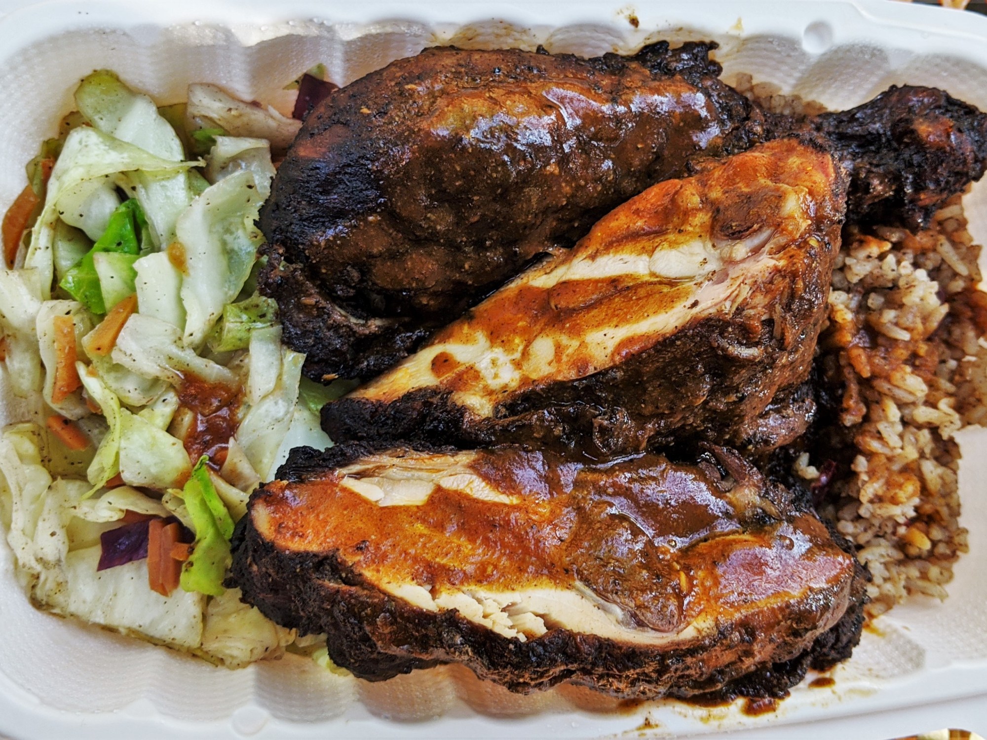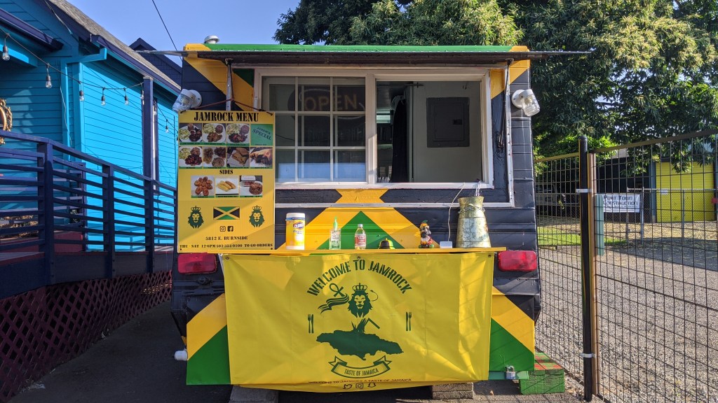 My latest cart stop was JamRock on 58th + East Burnside for jerk chicken and plantains. YUM. Spicy, juicy, slides-right-off-the-bone and it tasted like Christmas in July! For $12 you get 3 big, hot pieces on a bed of rice + cabbage slaw. The plantains were tasty too. I’ll definitely return and I’ll definitely order the same exact thing, but they DO have jerk tofu for our veg friends!