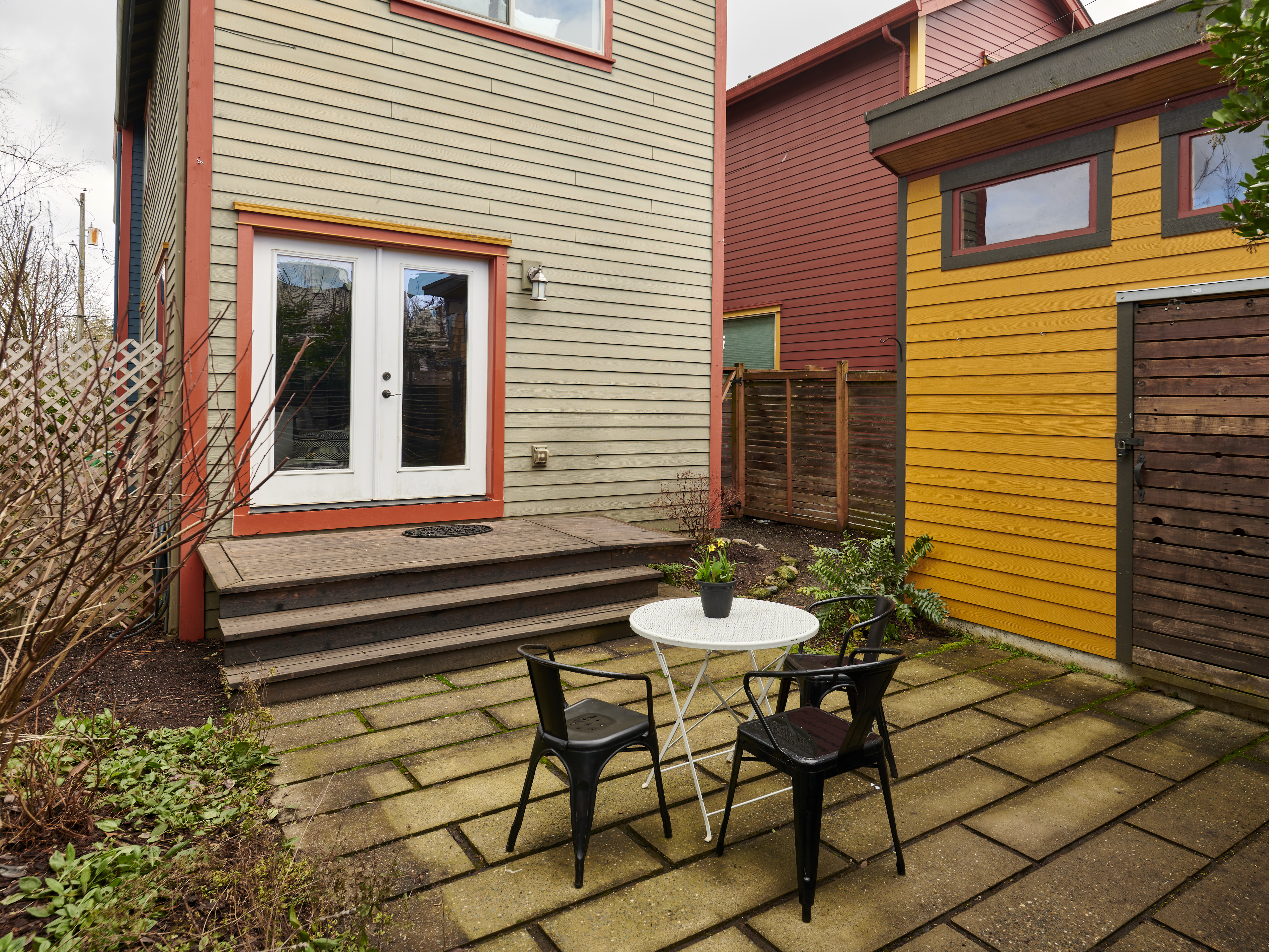 French doors open to the fenced backyard’s deck and patio great for al fresco dining in long summer nights. A chic storage shed nearby offers room for all of your hobbie equipment.