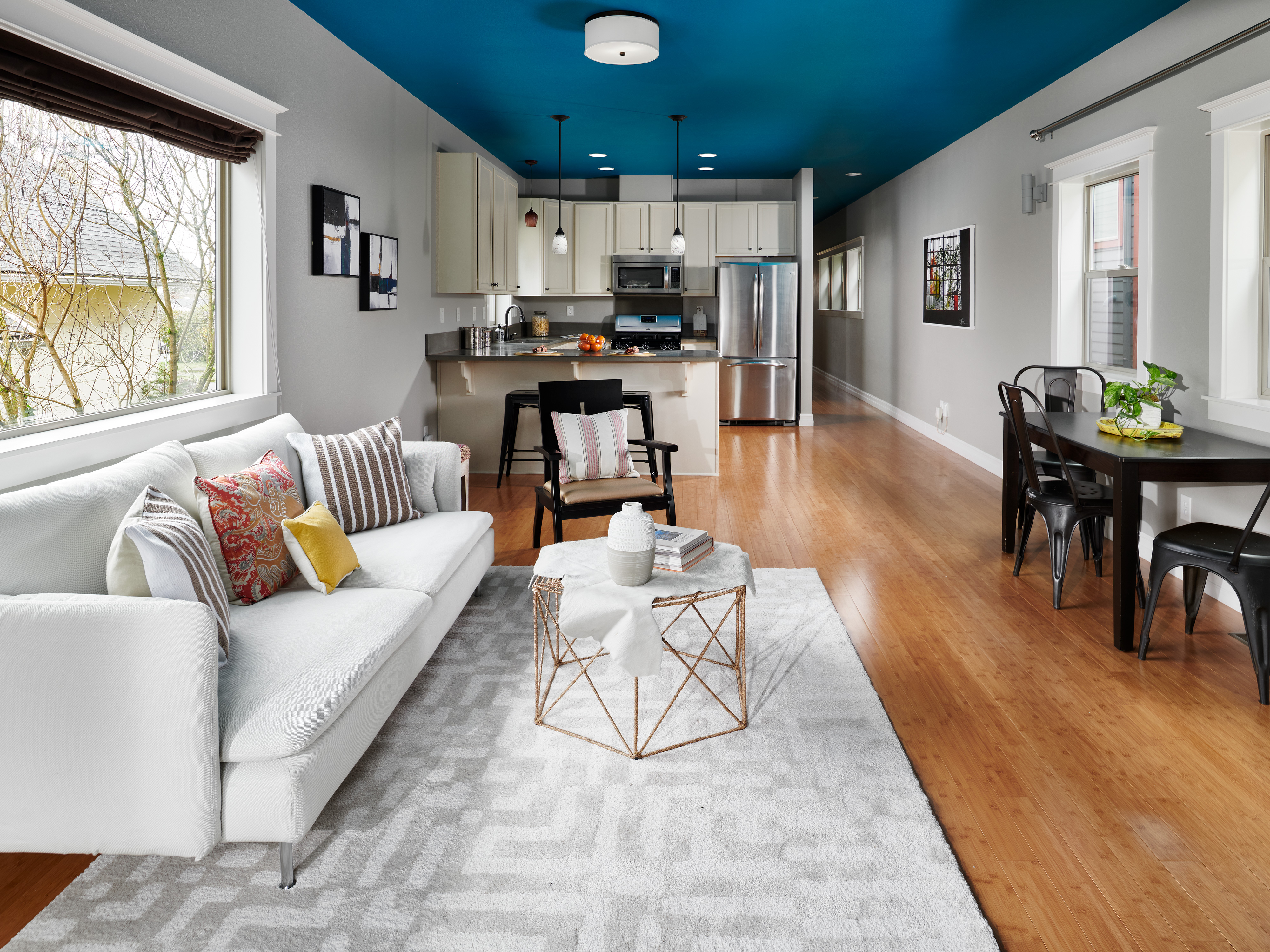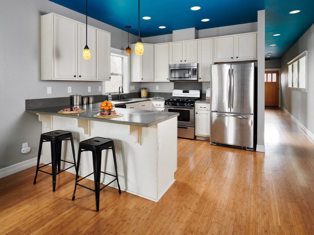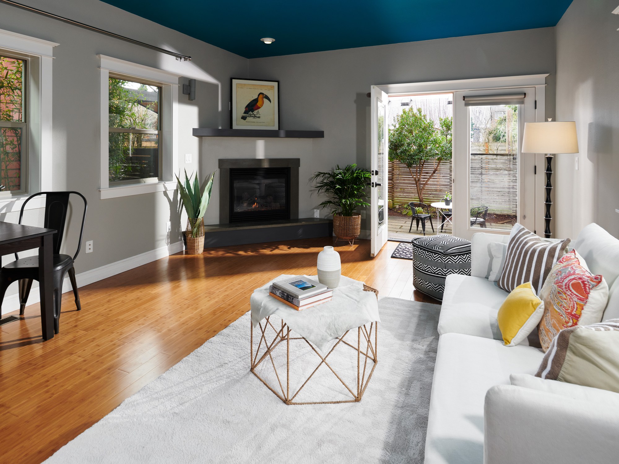 Inside, bamboo floors, concrete counters and a beautiful blue ceiling combine for sought-after modern, open concept living. You can prep food and cocktails in the kitchen area with SS appliances and a breakfast bar while guests stay toasty by the gas fireplace.