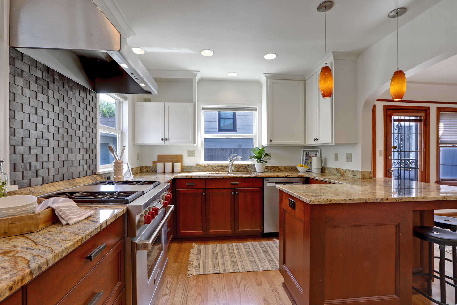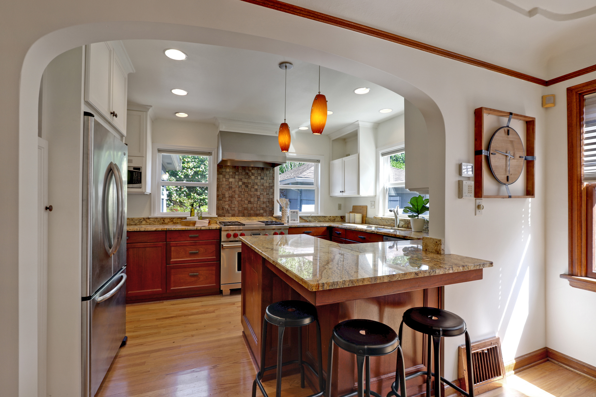 Entertain in style over sun-drenched hardwoods that flow under archways from the living room with fireplace to formal dining to the updated kitchen with stainless steel appliances & granite counters. Main level features 3 beds & 1.5 baths including the studio/bedroom with a half bath & separate entrance that could be an office or additional income generator.