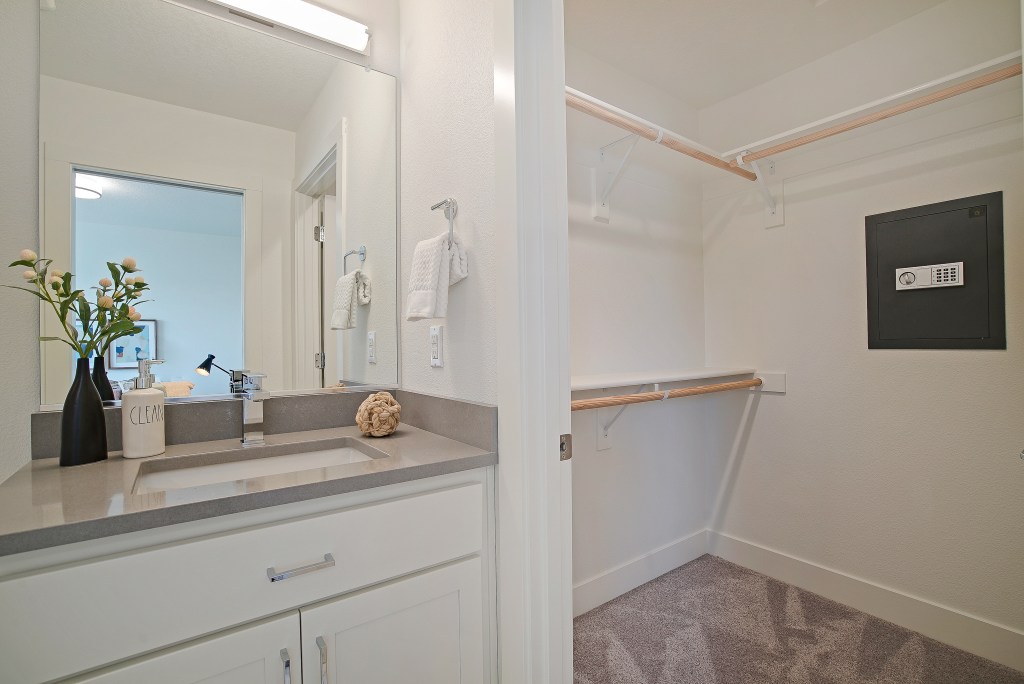 The second flight of stairs leads to a hall bath, laundry closet and 2 more bedrooms including the owner’s suite with a walk-in closet complete with a safe. All of the full baths have Bluetooth speakers.