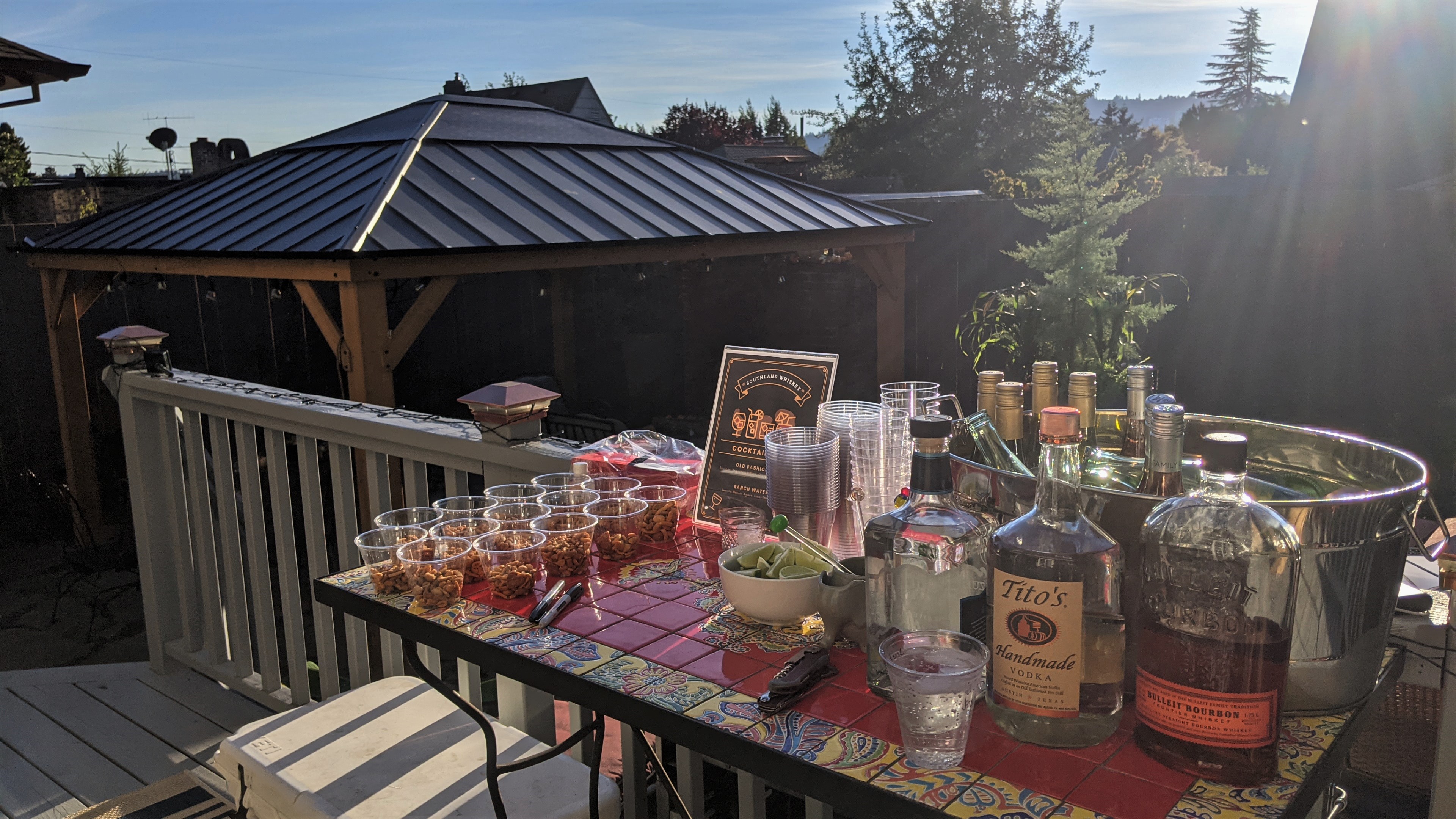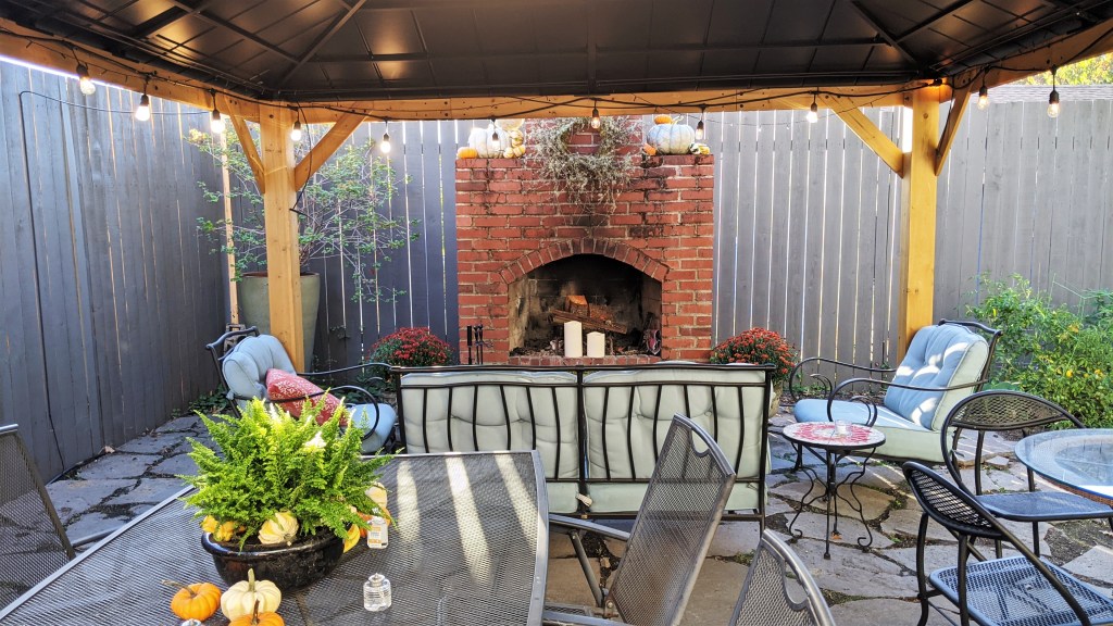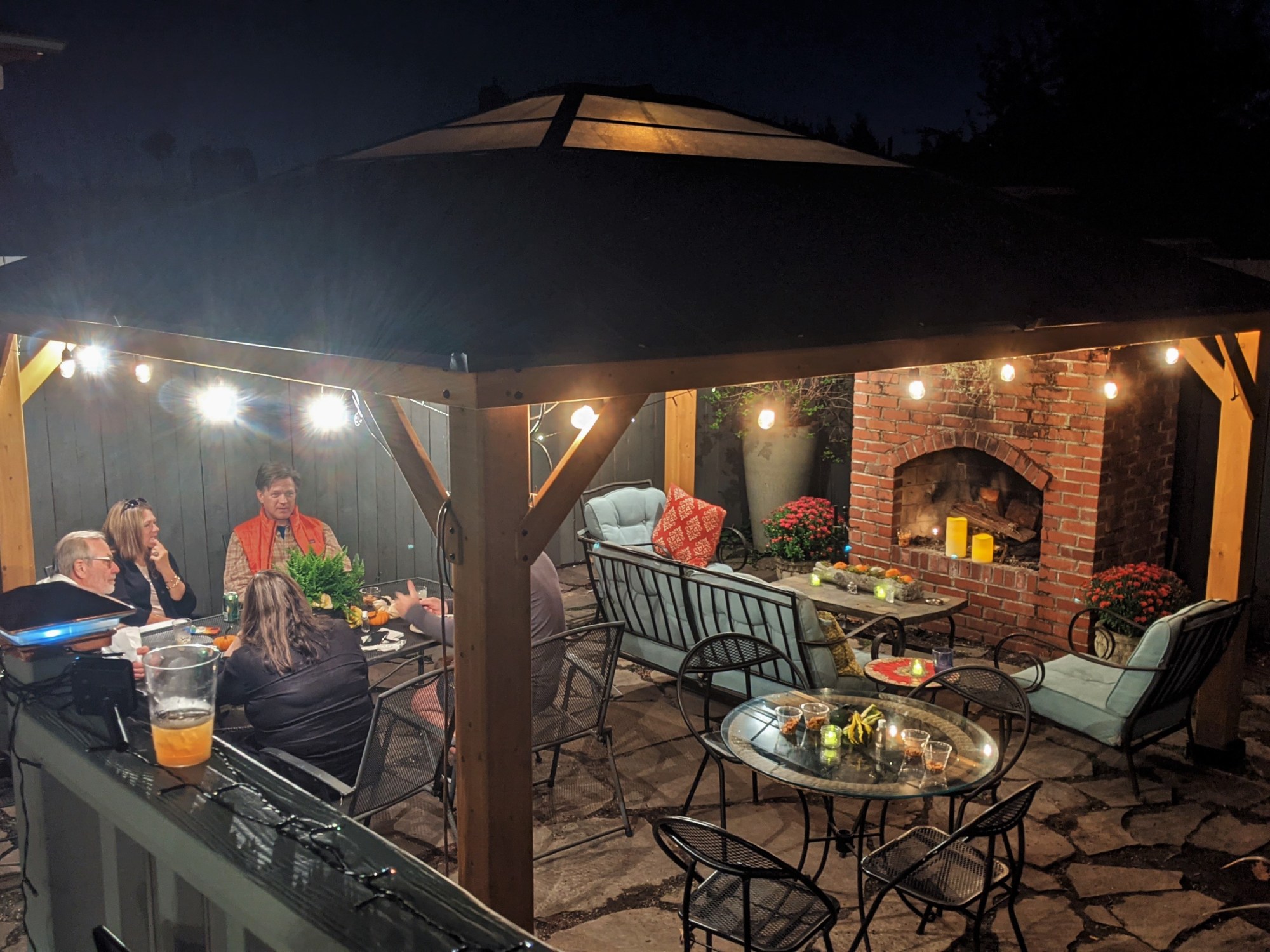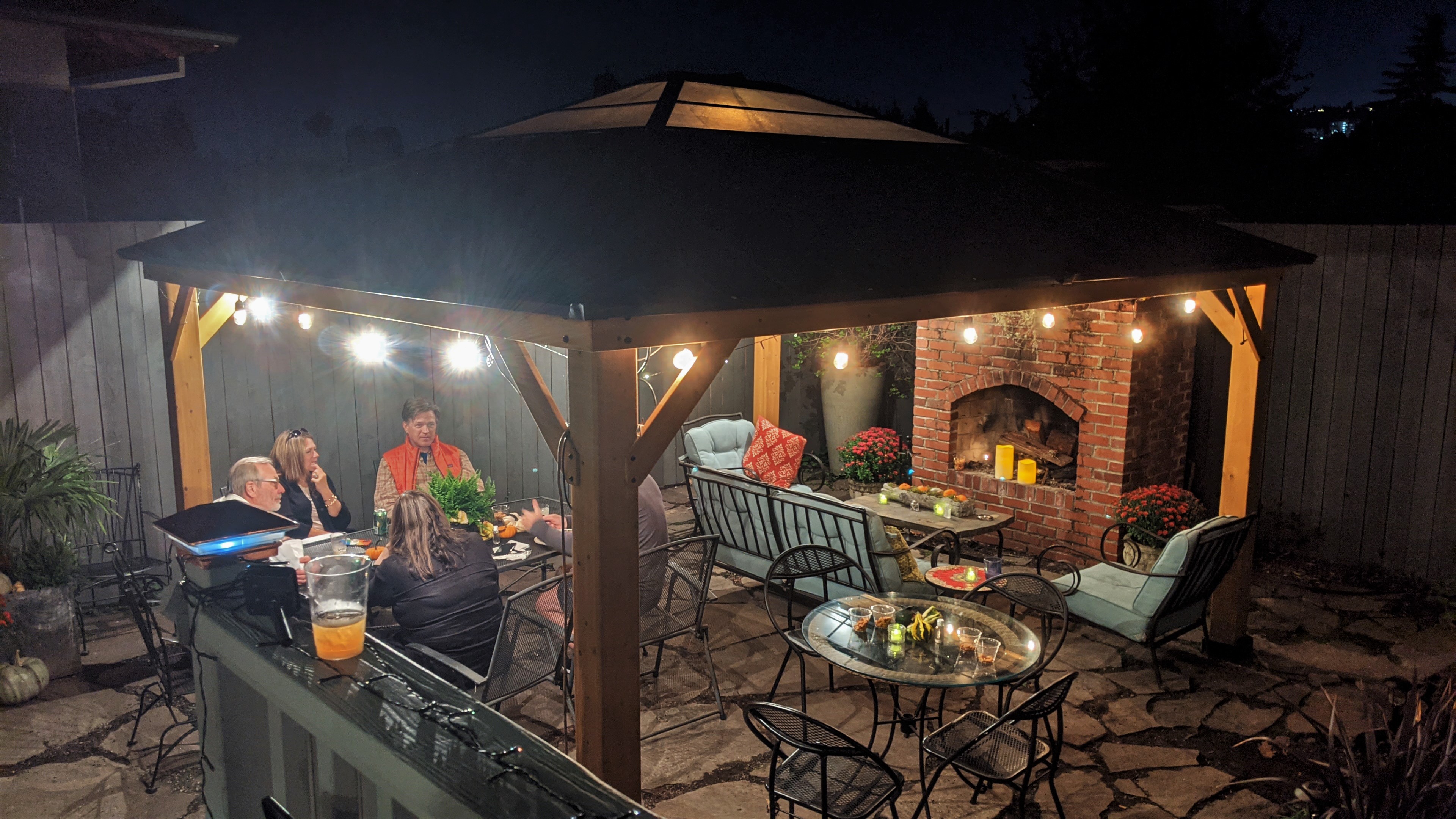Susie’s backyard, on the other hand, already had the fireplace but was lacking a way to enjoy it during the rains. A quick search on Wayfair revealed loads of options of all sizes and she ended up with the perfect wood gazebo large enough to cover a seating area and dining table. For under $2,000, her year-round entertaining space has greatly expanded. Check out the gazebo action shots from a recent fundraiser!