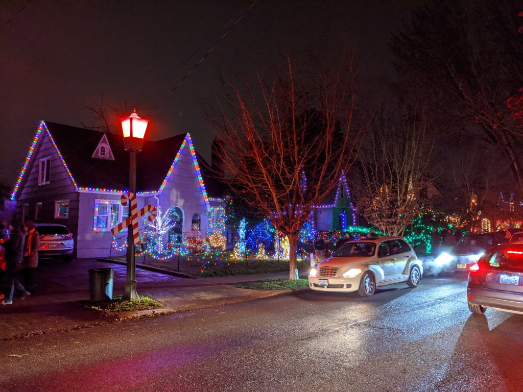 The lights are back on on Peacock Lane! After 2020’s cancellation due to COVID I am thrilled to return to the most festive holiday street in PDX this year. Storybook home after storybook home adorned with bulbs and baubles of all sorts span the whole stretch of SE PDX’s Peacock Lane from Stark to Belmont.