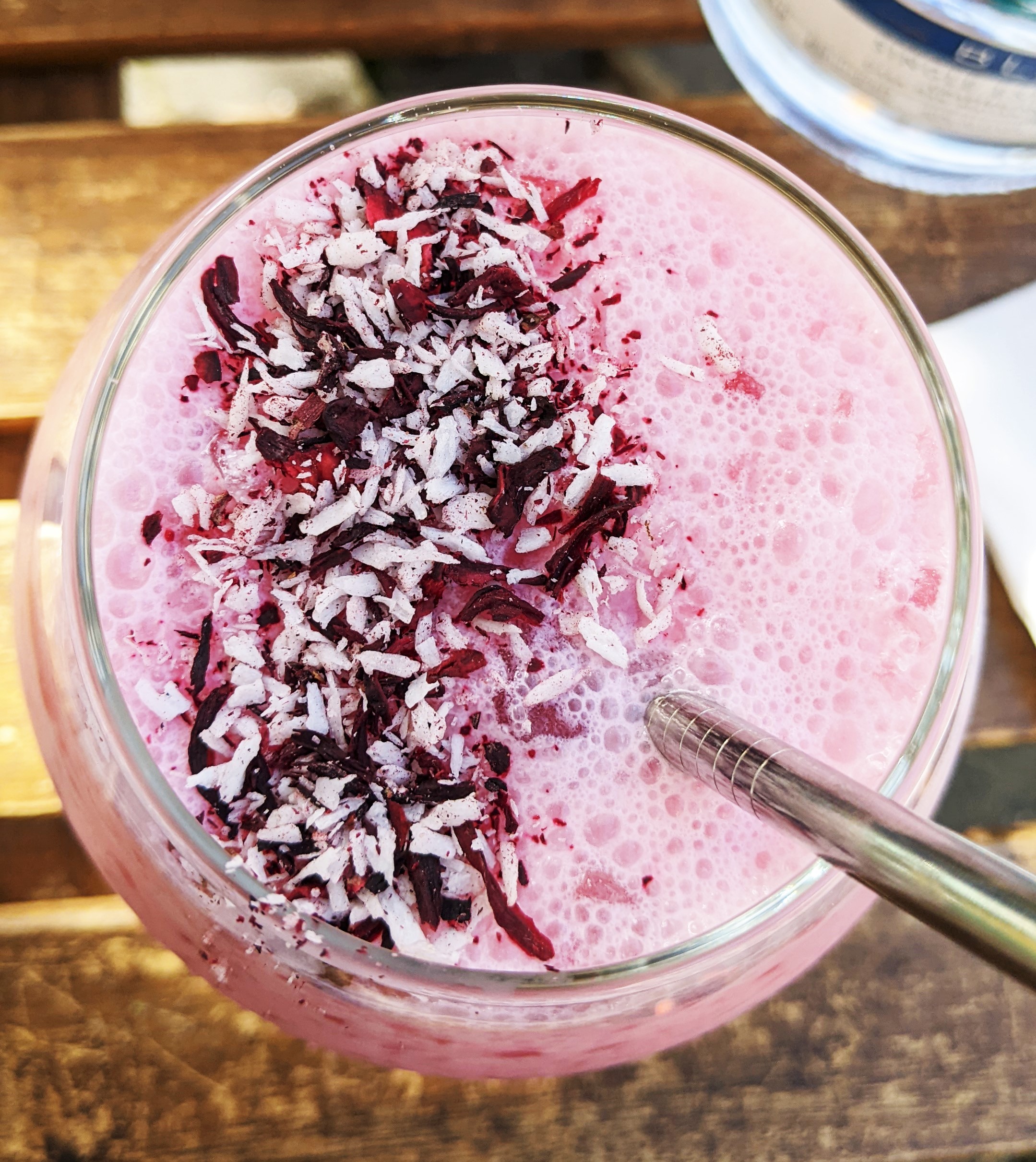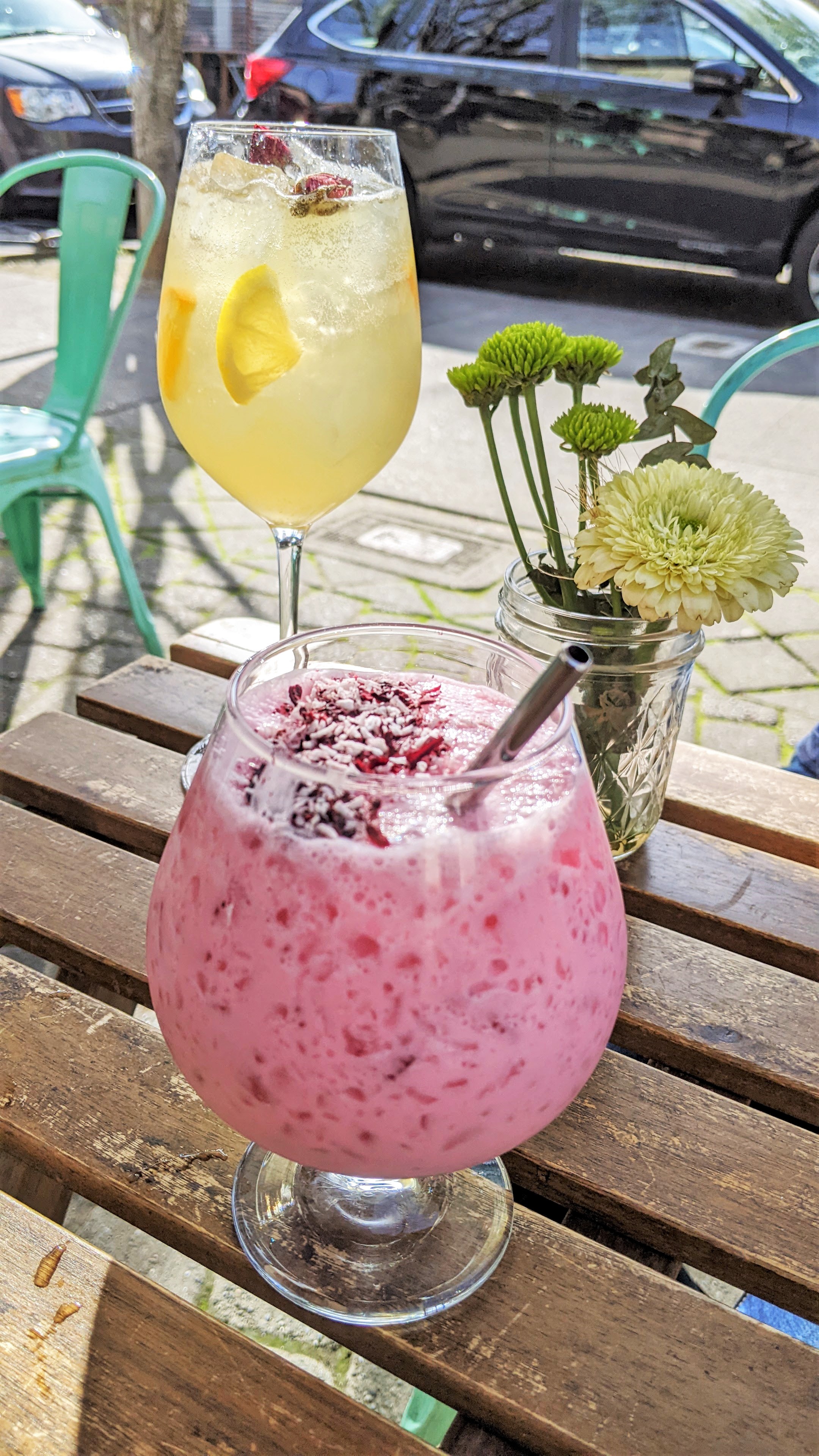Enter: The Blissful Thinking Mocktail. Wilderton “Lustre” Botanical Distillate (think, non-alcoholic gin), coconut cream, dragon fruit, hibiscus, lime. Are you ready to see the prettiest pink potion? Who needs booze when you can have THIS?! This would be a *perfect* surprise beverage for a teetotaling bday celebrant (or child!)