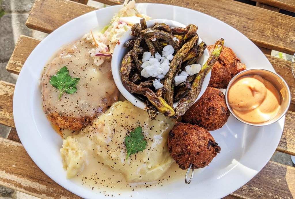 The Food: In general I like asking restaurant staff for the fan favorites and these guys said to get the Nashville Chick’n Plate and so I did … and we chose right! Country fried chick’n tossed in house-made Nashville hot sauce & gravy. And it came with a pinch of slaw and 3 (!) sides. I’d return for the mashed potatoes & gravy and the hushpuppies any day but I probably wouldn’t re-order the asparagus because it was topped with vegan feta which has a very strong/acquired taste that’s not for me. (Or I’d leave the feta off.)