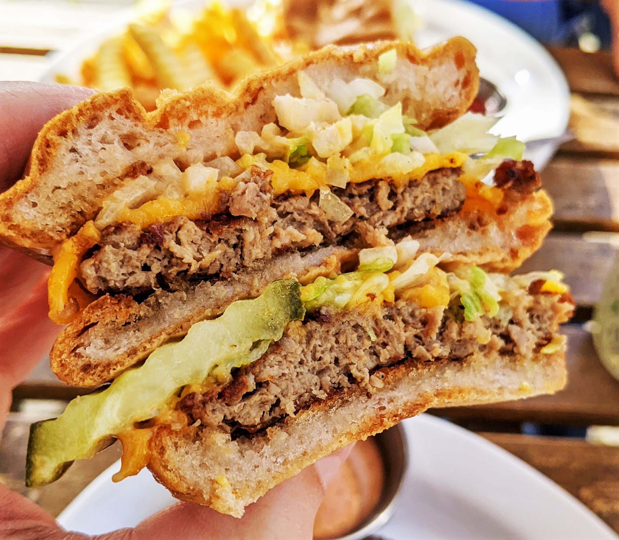 My buddy let me try their GF Big Mick and this would satisfy any burger baby in the bunch: Two 1/8lb patties, three buns toasted in butter, two slices of cheese, shredded lettuce, diced onions, pickles, and secret sauce. Comes with fries. It was a remarkably scrumptious bar burger.