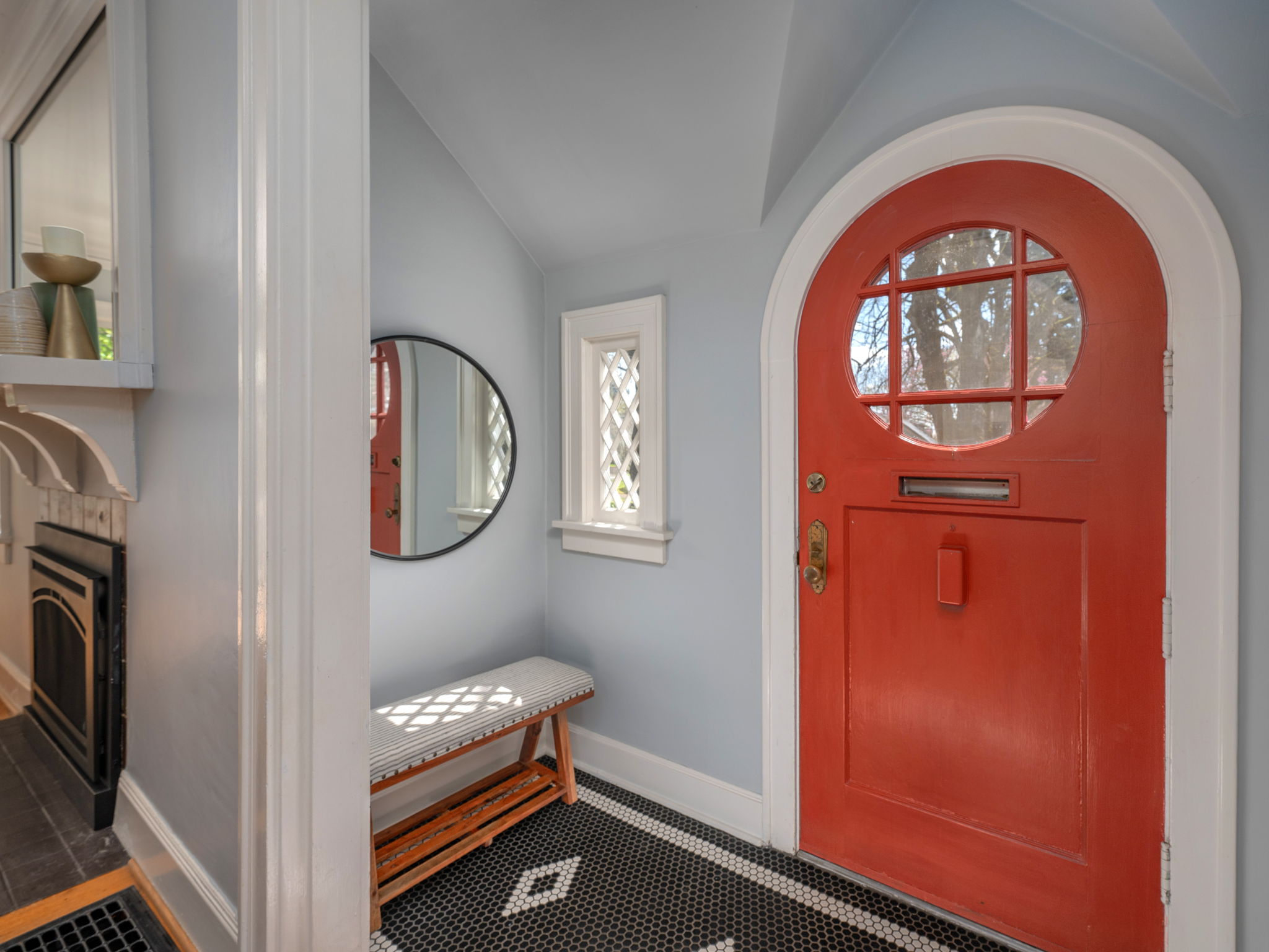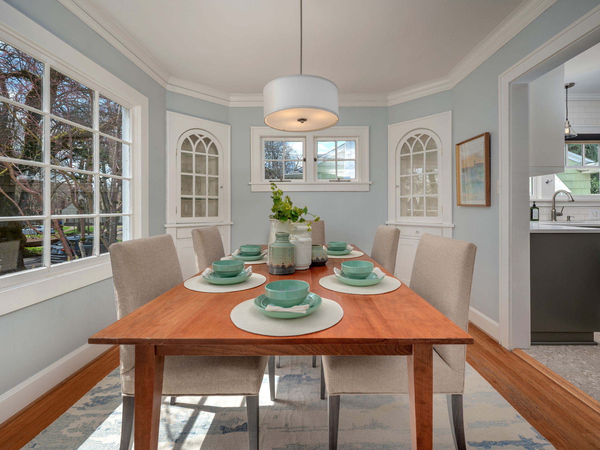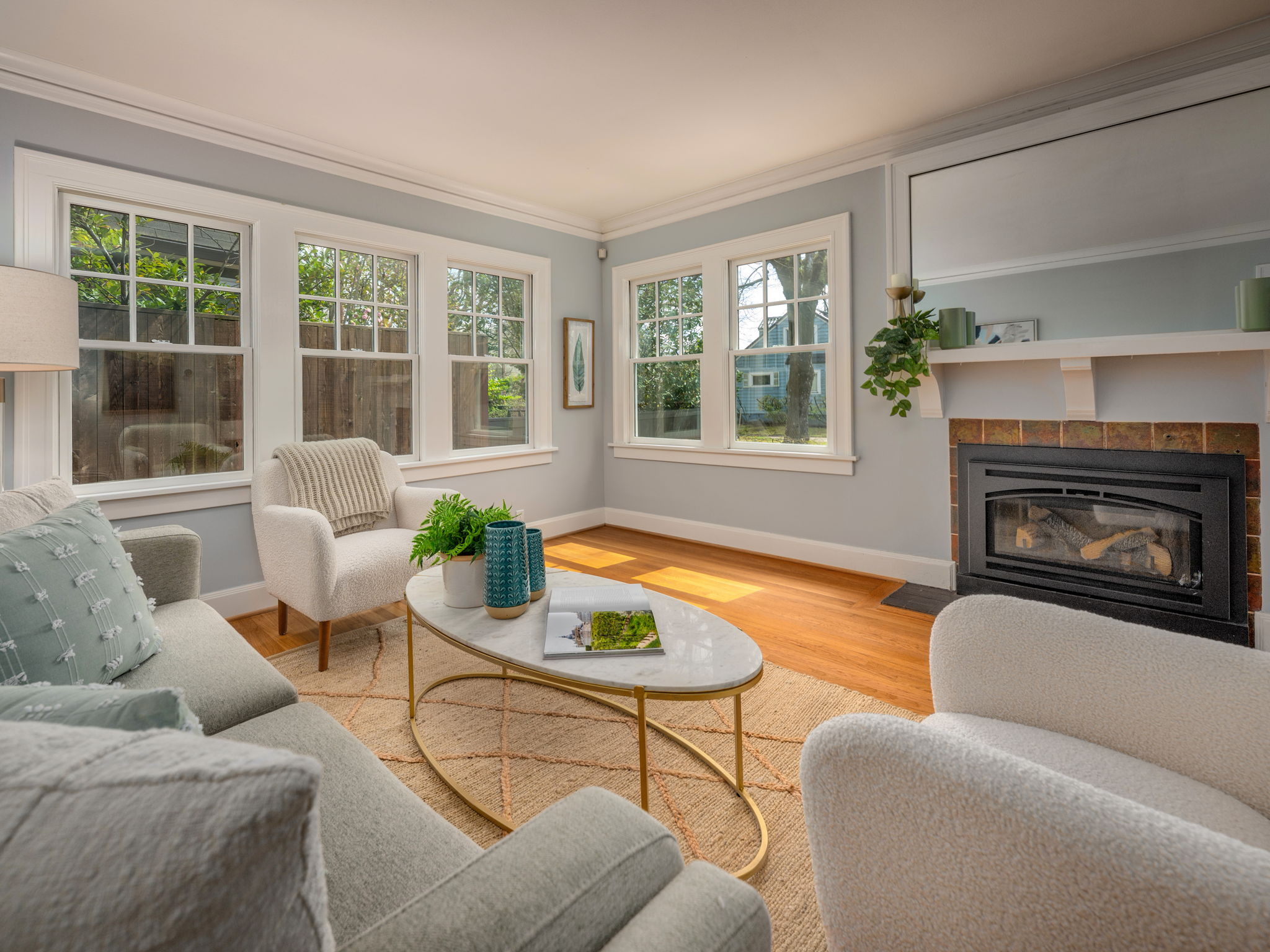 Delightful updates alongside 1920s charm: Wood windows, designer lighting & hardwood floors in sunny living room w/ gas fireplace & formal dining w/ built-ins: