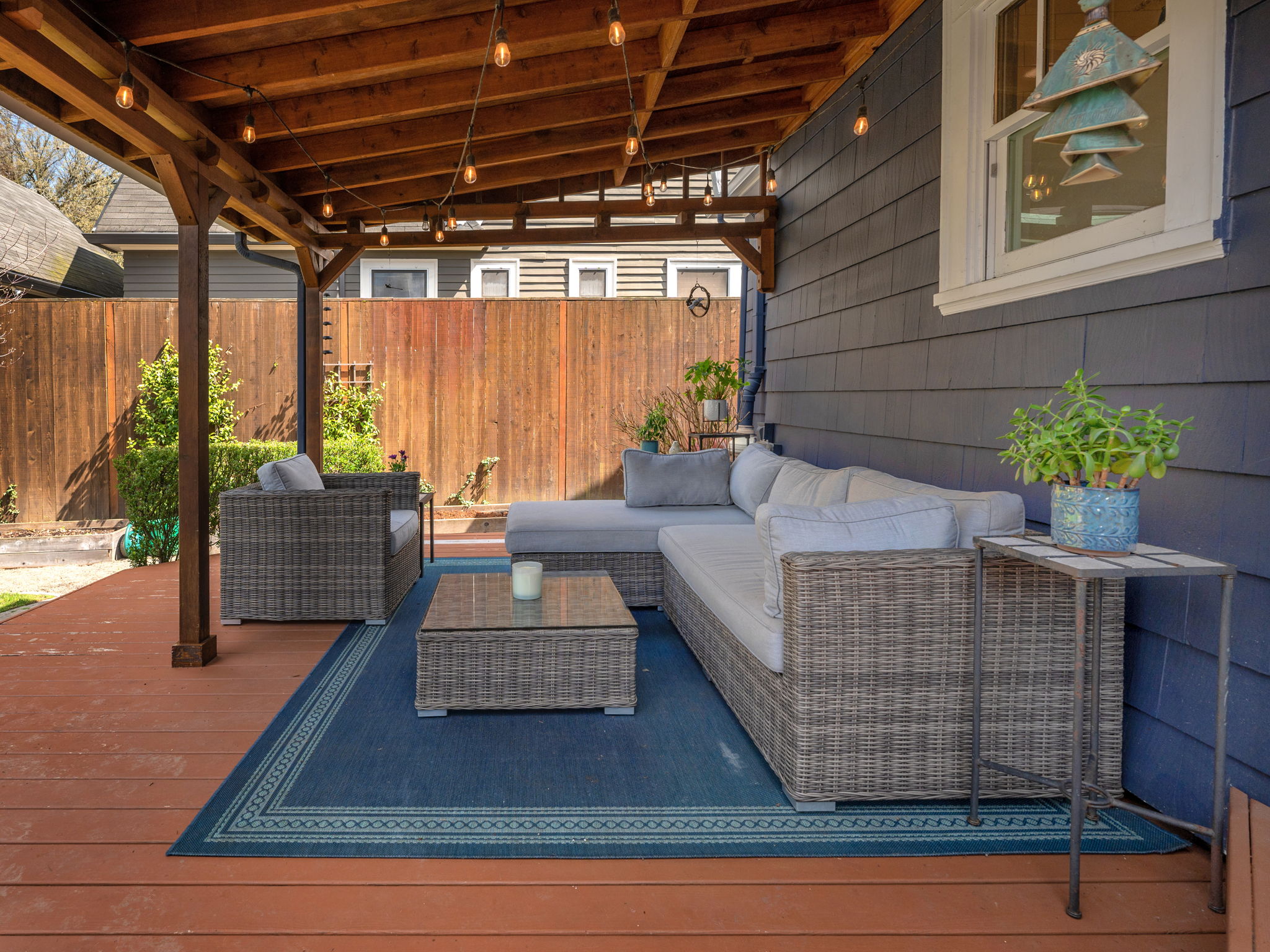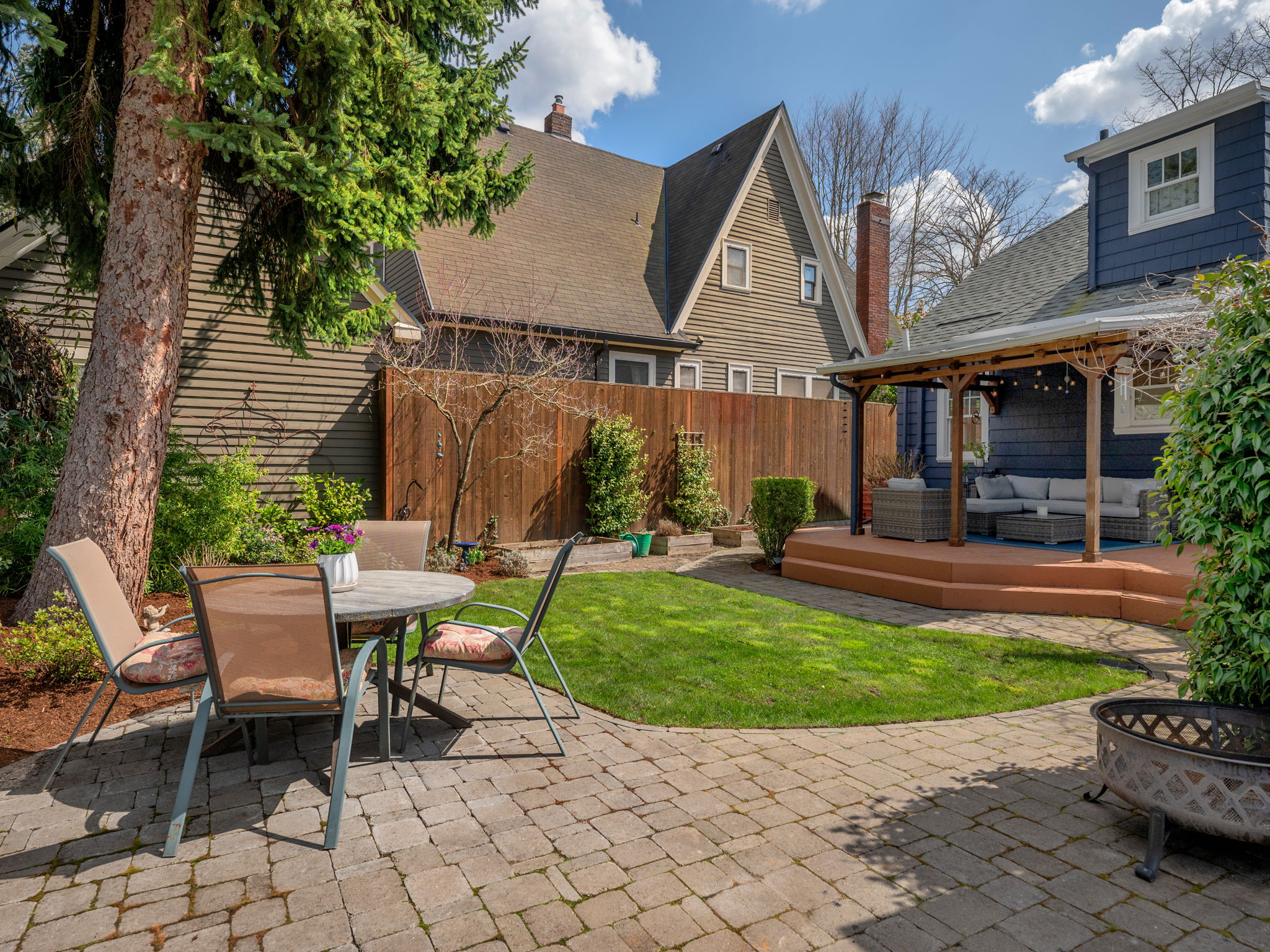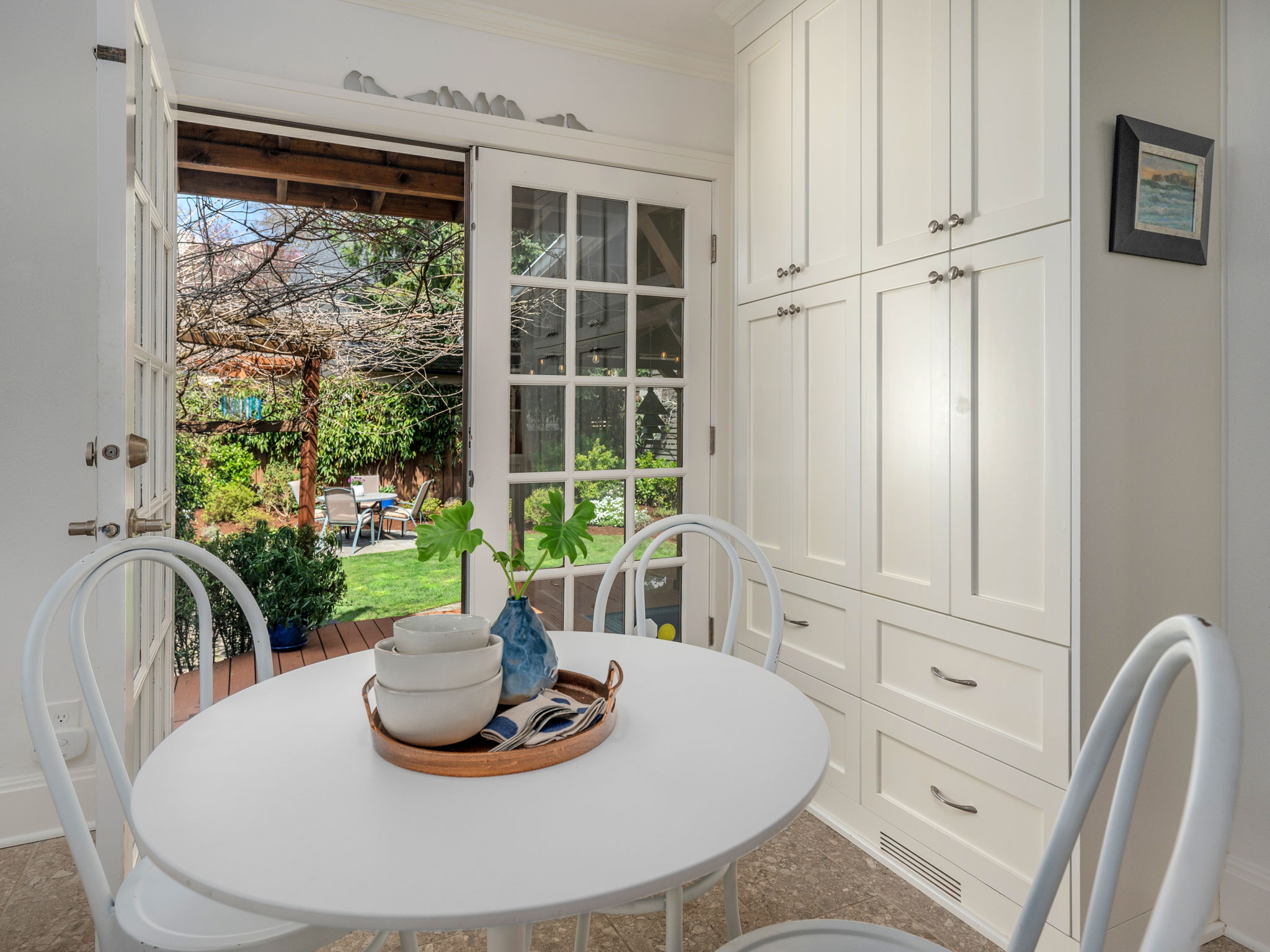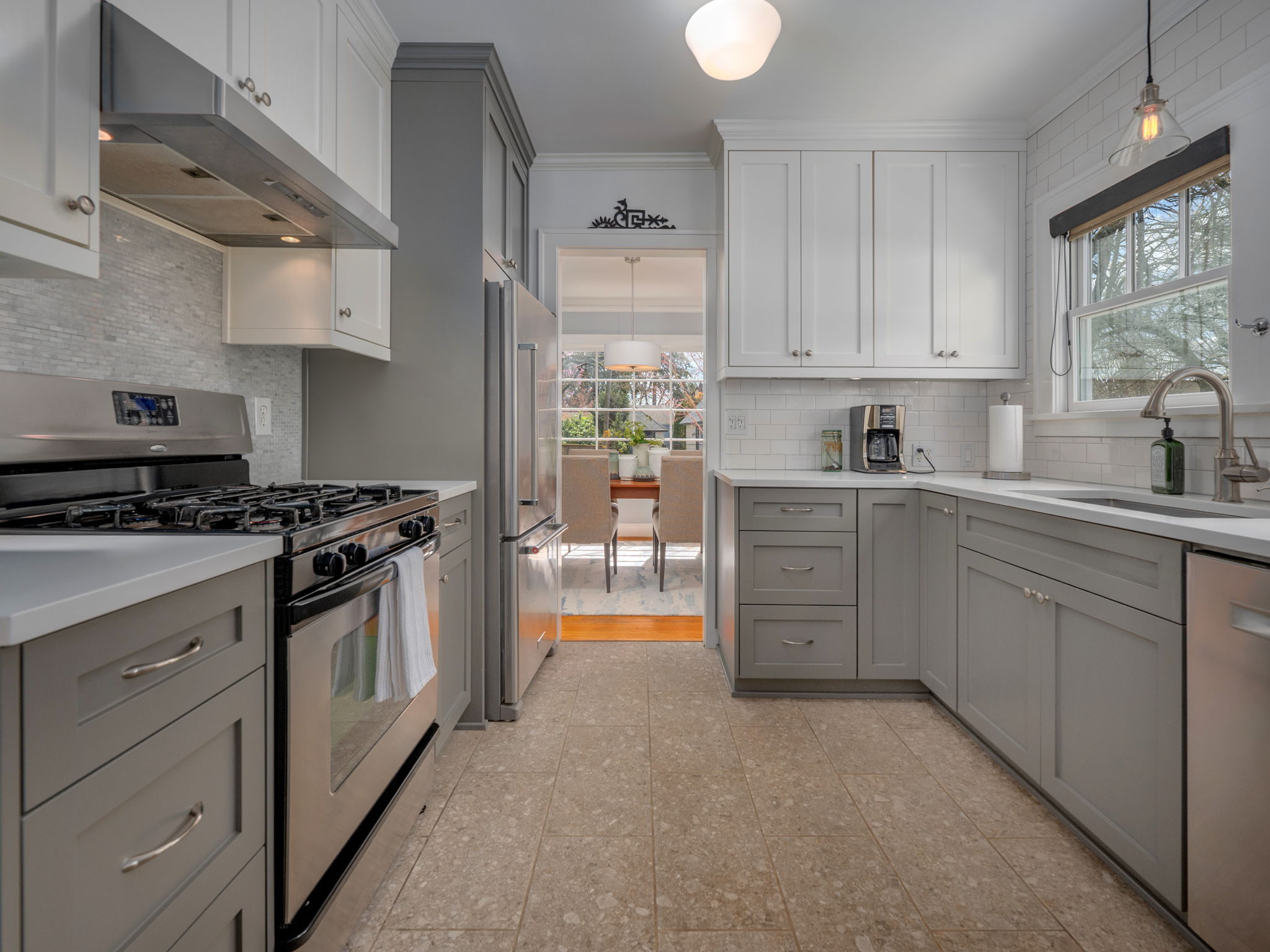 Remodeled bakers kitchen w/ full tile backsplash, quartz counters, SS appliances & nook. French doors lead to a dreamy deck w/ covered space for year-round entertaining in private, fenced backyard.