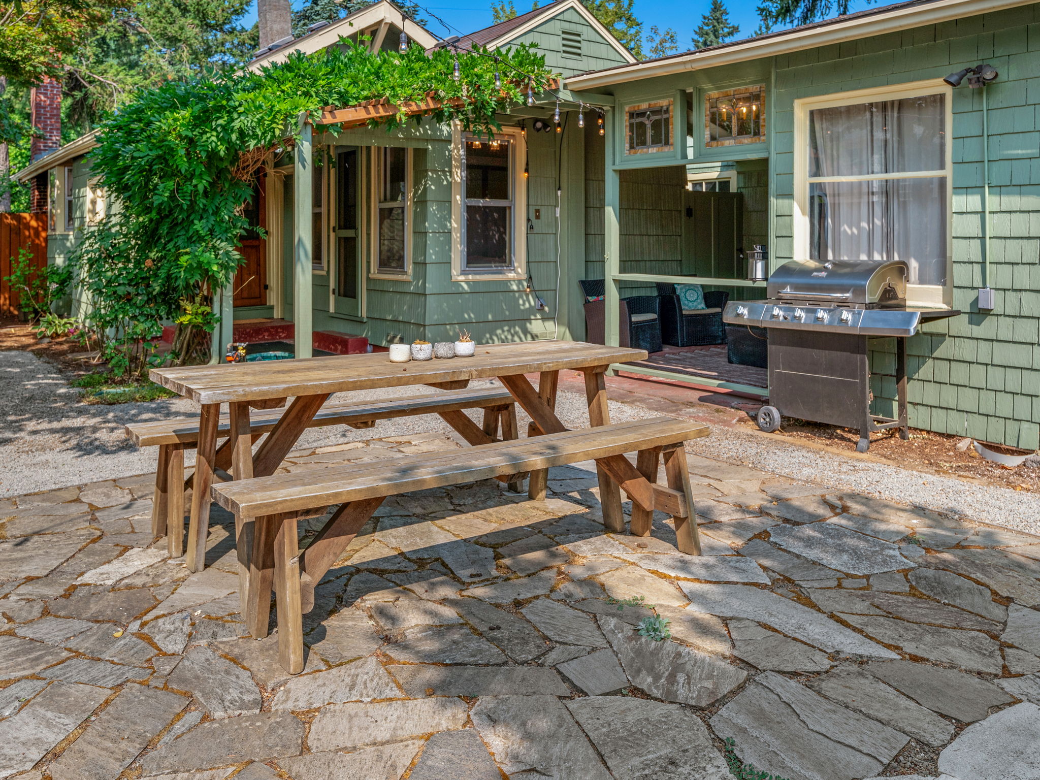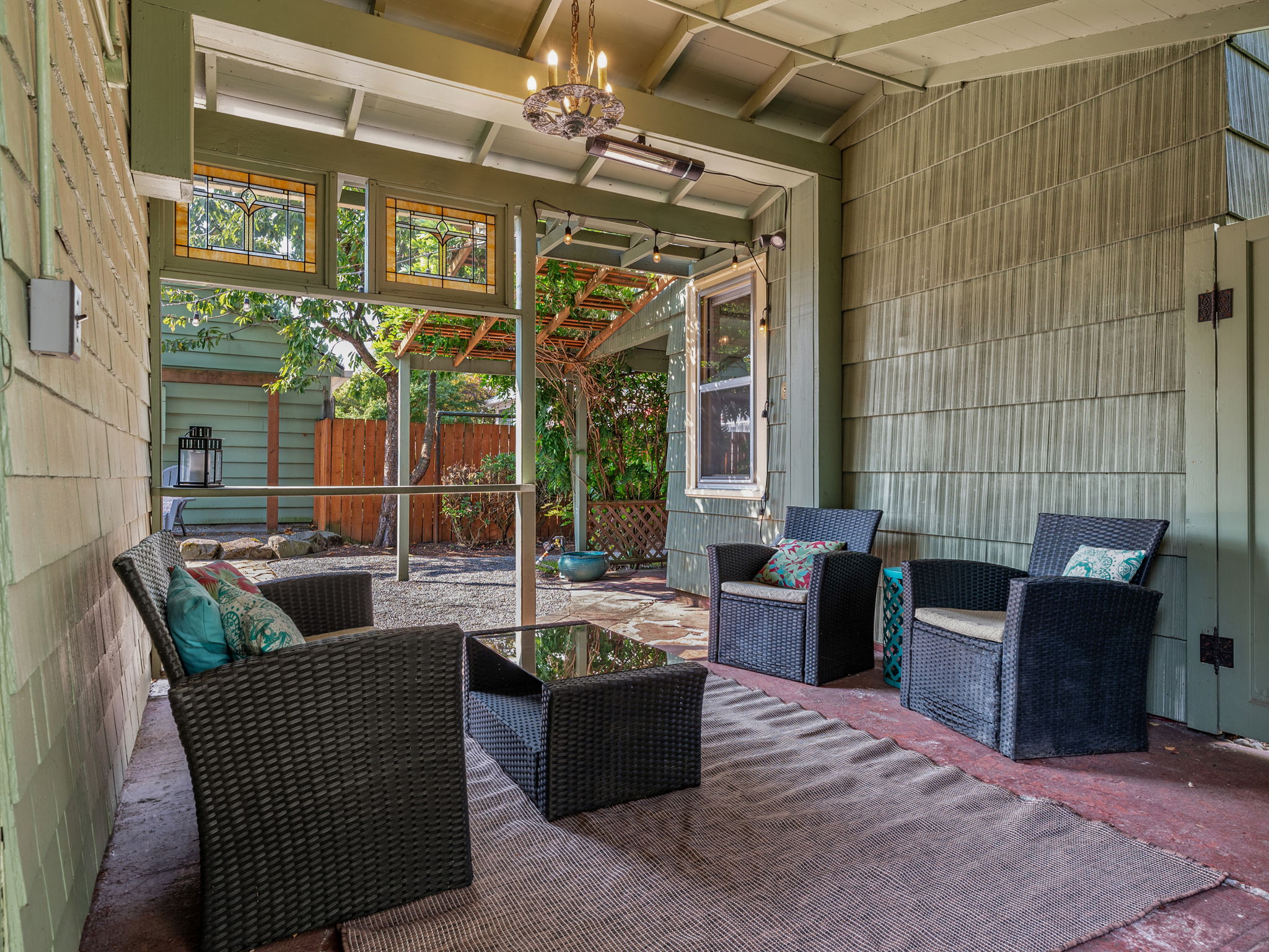 - Whimsical gardens and heated, covered area